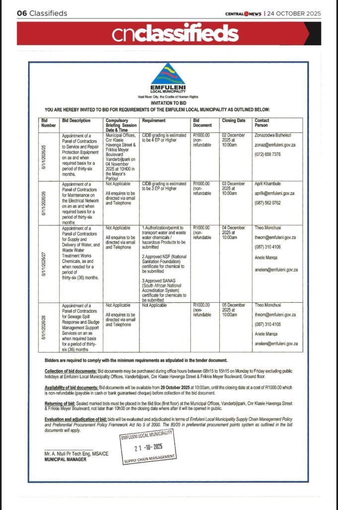 Bid documents will be available for purchase from 29 October 2025 at 10h00 at the Emfuleni Local Municipality Offices, Vanderbijlpark, corner Klasie Havenga Street and Frikkie Meyer Boulevard (Ground Floor).
